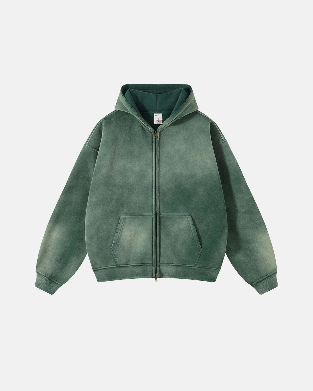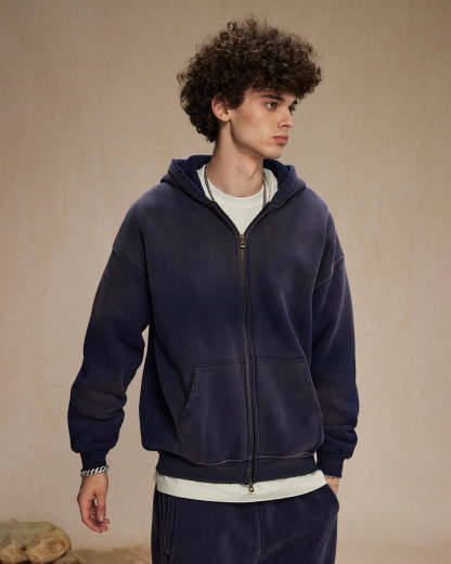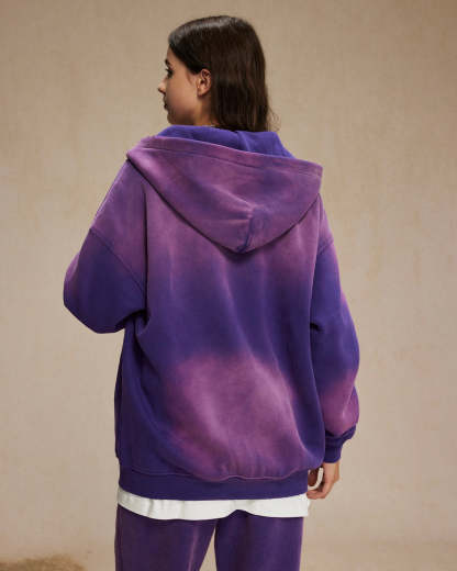 The INFLATION Monkey Wash Spray-Dyed Hoodie is an eco-friendly streetwear hoodie made for eco-friendly streetwear lovers. Crafted from heavyweight 360G fleece, it offers warmth and comfort for fall and winter layering. With its oversized fit zip up design, authentic distressed and worn-in look, double zipper, and ripped hood edge details, this piece delivers true vintage streetwear style.