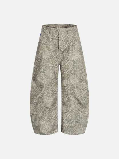 Leopard print enhances the relaxed, baaggy barrel design with a refined and stylish touch. The washed finish adds depth and texture, creating a sophisticated look that effortlessly balances comfort and fashion.