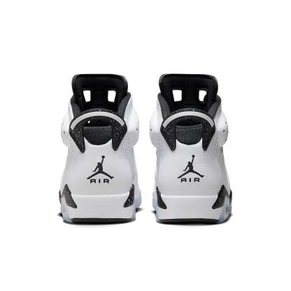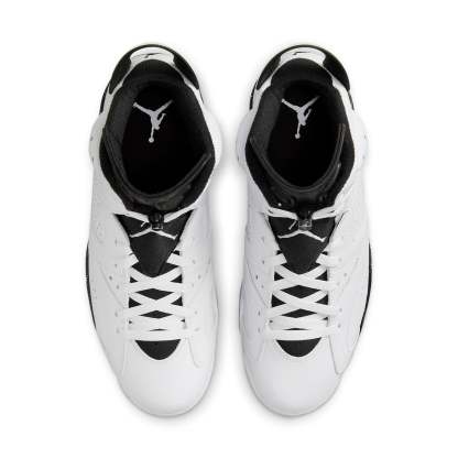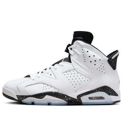 The Air Jordan 6 Retro ‘Reverse Oreo’ is a striking sneaker that combines classic design with modern flair. Its white leather upper features breathable perforations throughout the midfoot and collar. The black two-hole tongue and matching black heel tab, speckled with white, add a unique touch. Jumpman branding on the neoprene lace cover and back heel completes the look. The black polyurethane midsole houses a visible Air-sole unit in the heel, while the translucent rubber outsole provides traction.