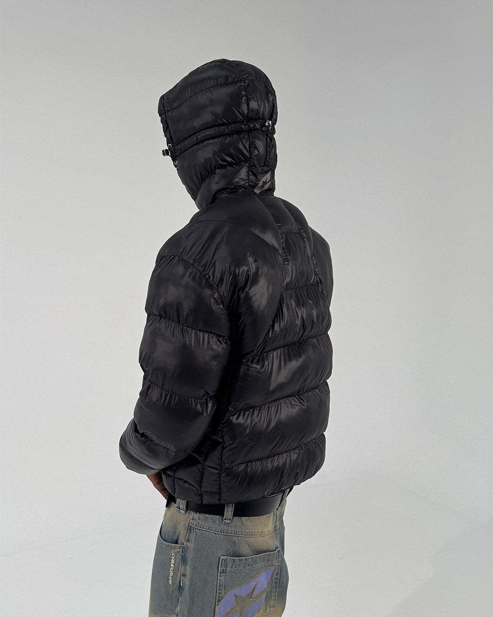 Puffer jacket with multiple panels.