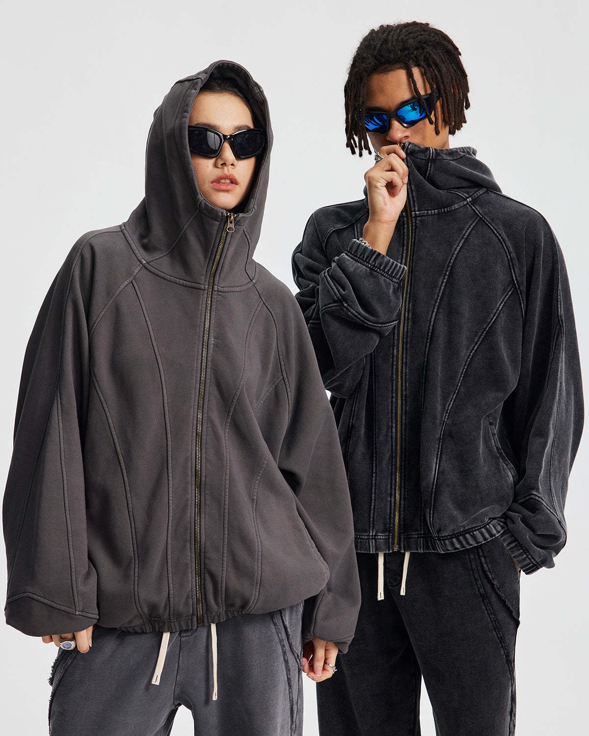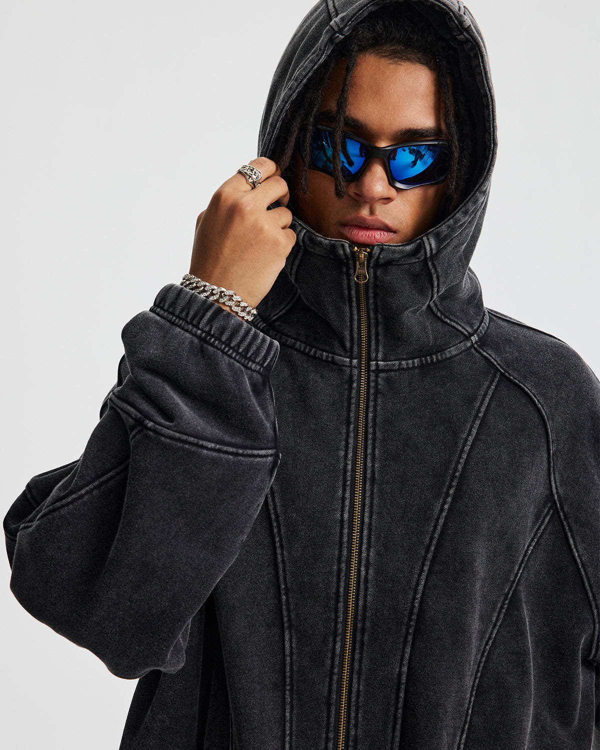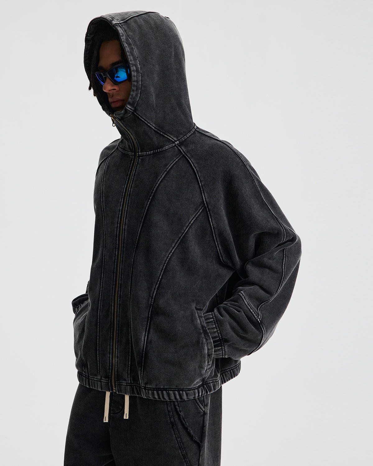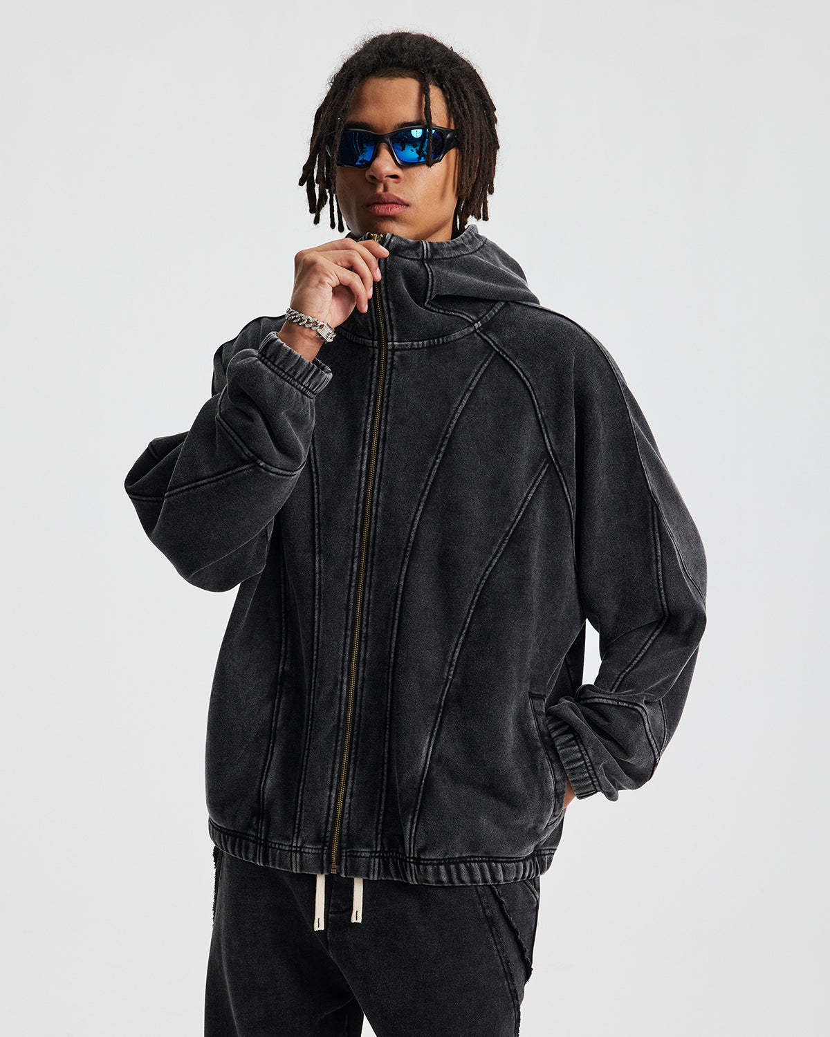 Distressed Stiching Aicd Wash Zip Up Hoodies | Streetwear