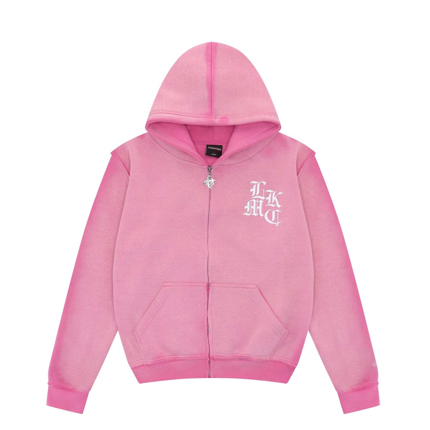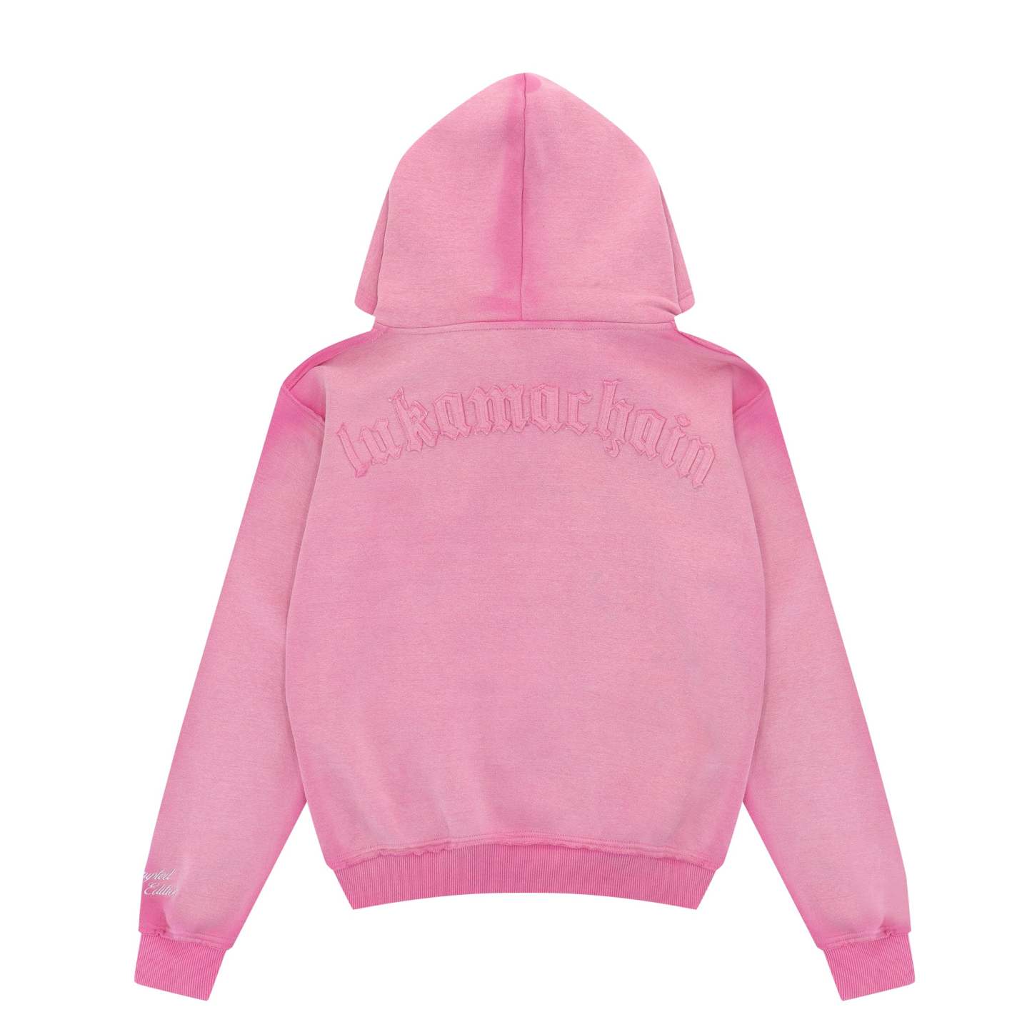 Washed & distressed pink zip hoodie with distressed logo embroidery on the back