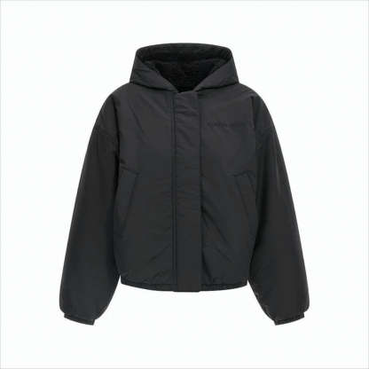 Dual-Texture Black Jacket With Hood And Concealed Zipper
