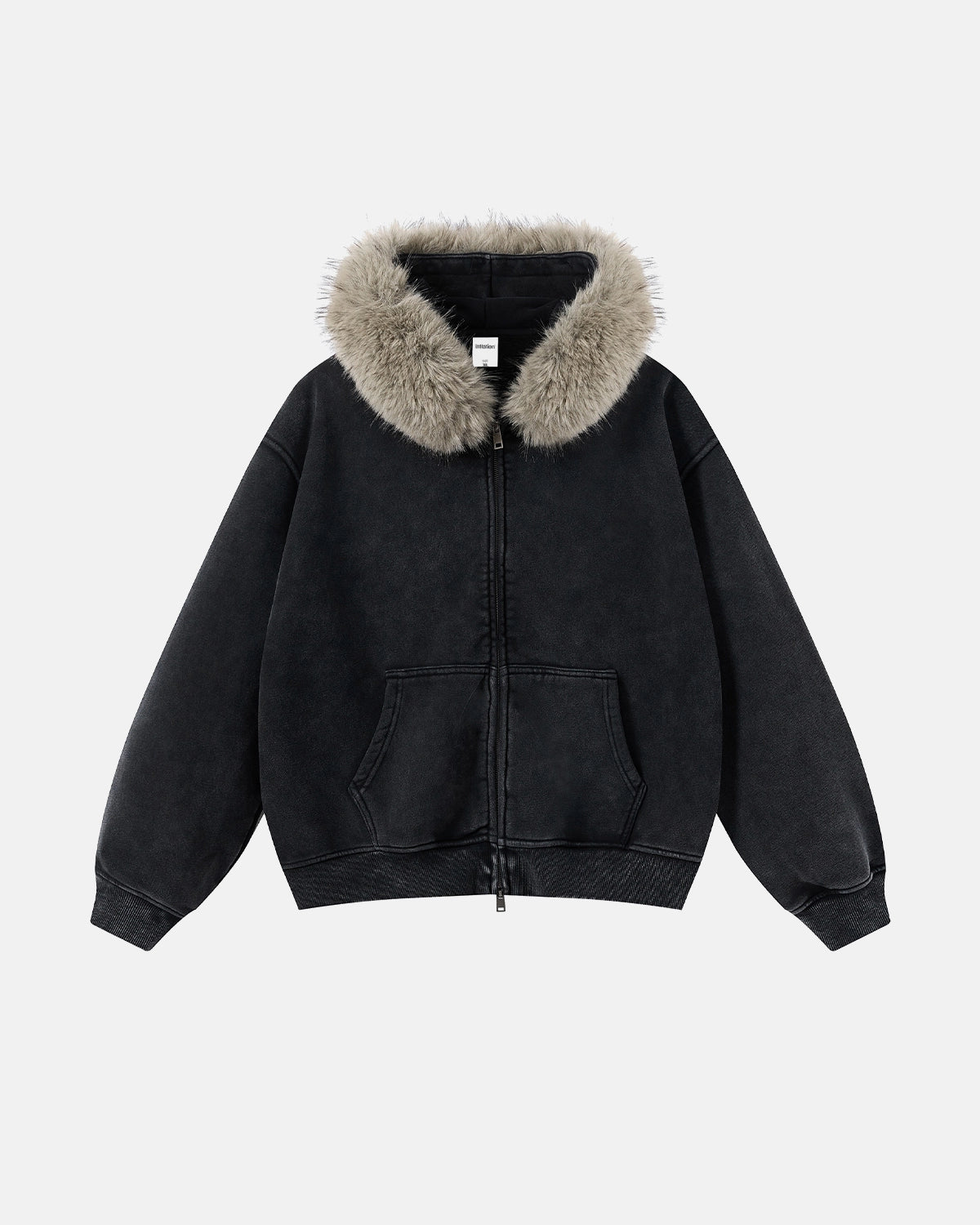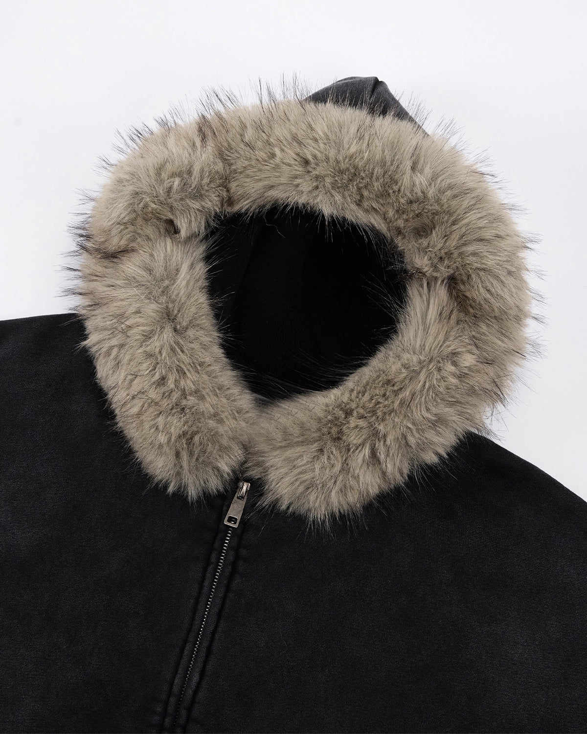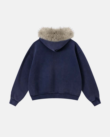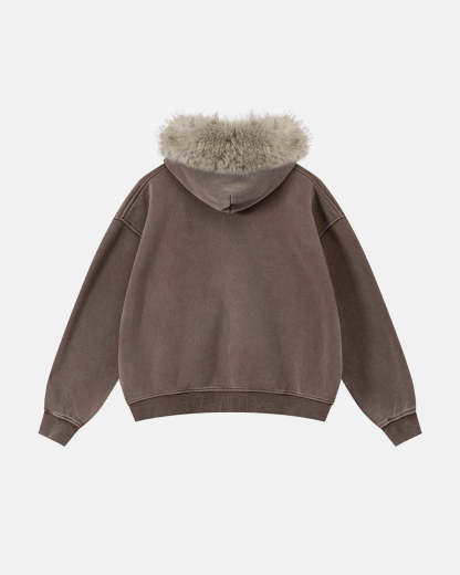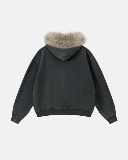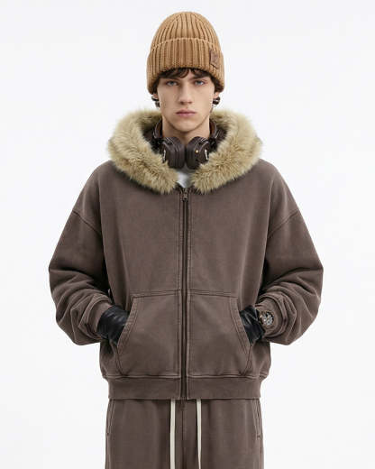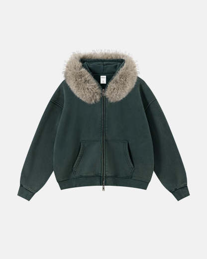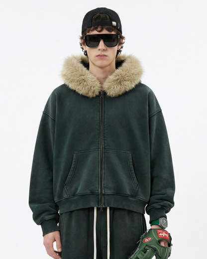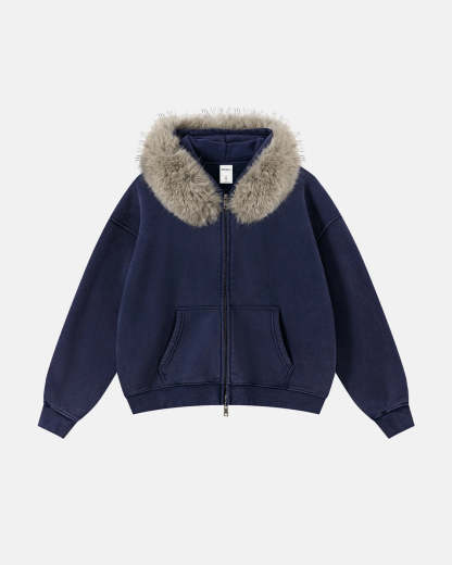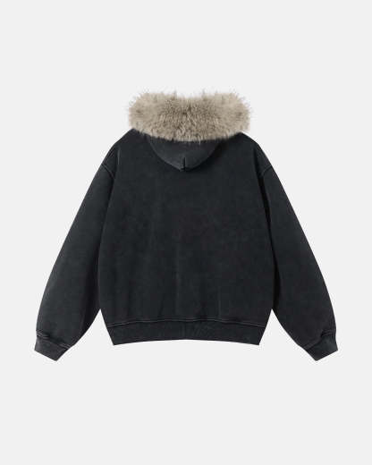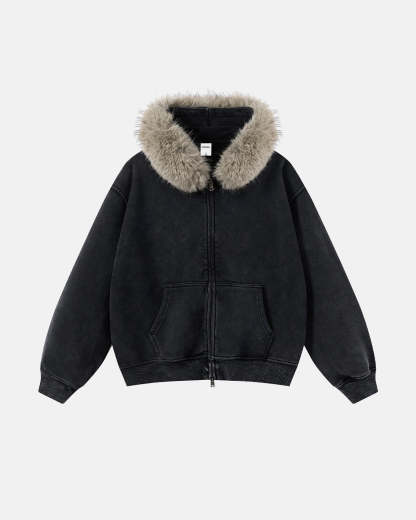 Faux Fur Collar Acid Wash Zip Up Hoodies | Streetwear
