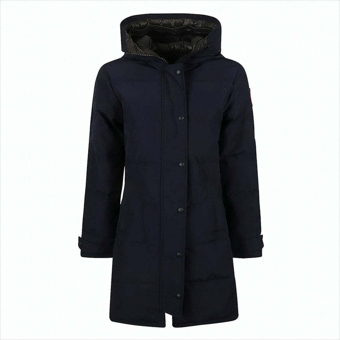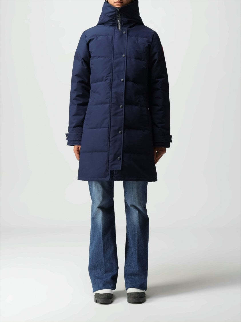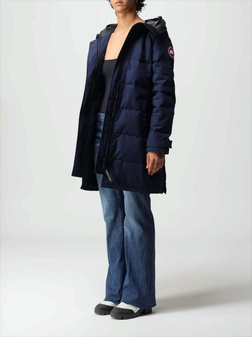 Canada Goose offers a luxurious quilted longline parka designed for exceptional warmth and durability. This elegant piece features a hood, adjustable cuffs, and side pockets, all in a stylish blue color. The padded construction, highlighted by horizontal stitching and a logo patch on the upper sleeve, reflects the brand's dedication to superior craftsmanship and practicality.