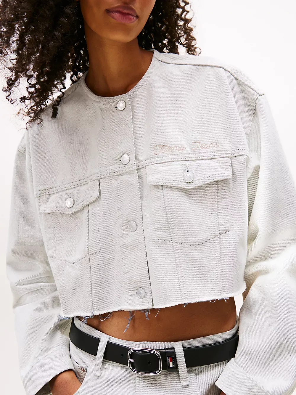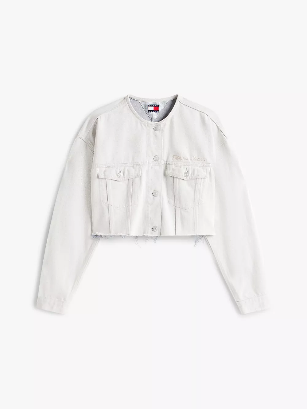 Tommy Hilfiger women's jacket. Cut for a boxy, comfortably oversized fit, this collarless denim jacket is designed with a raw, cropped hem that adds a lived-in look and vintage appeal. Part of our Tommy Jeans collection.