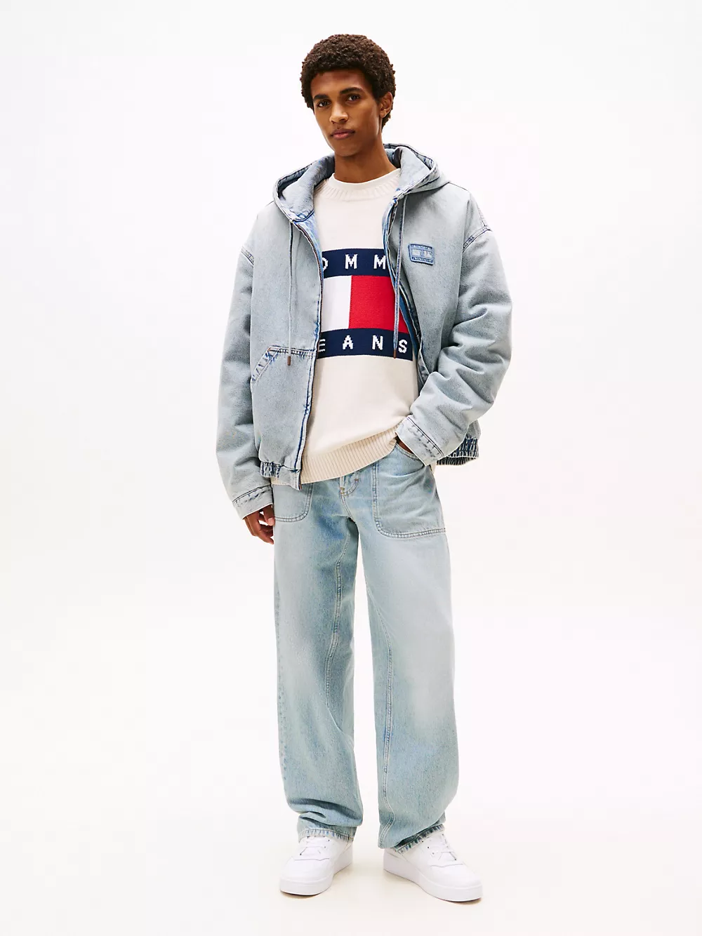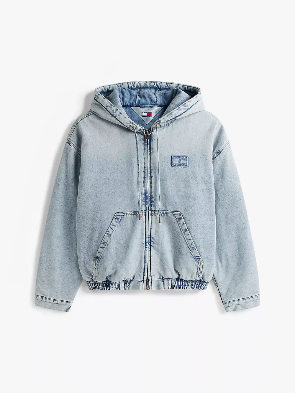 Tommy Hilfiger men's jacket. Our hybrid jacket combines the warmth of an insulated puffer with the laid-back look of denim. It's finished with a drawstring hood, kanga pockets and a padded lining to keep the chill at bay. Part of our Tommy Jeans collection.