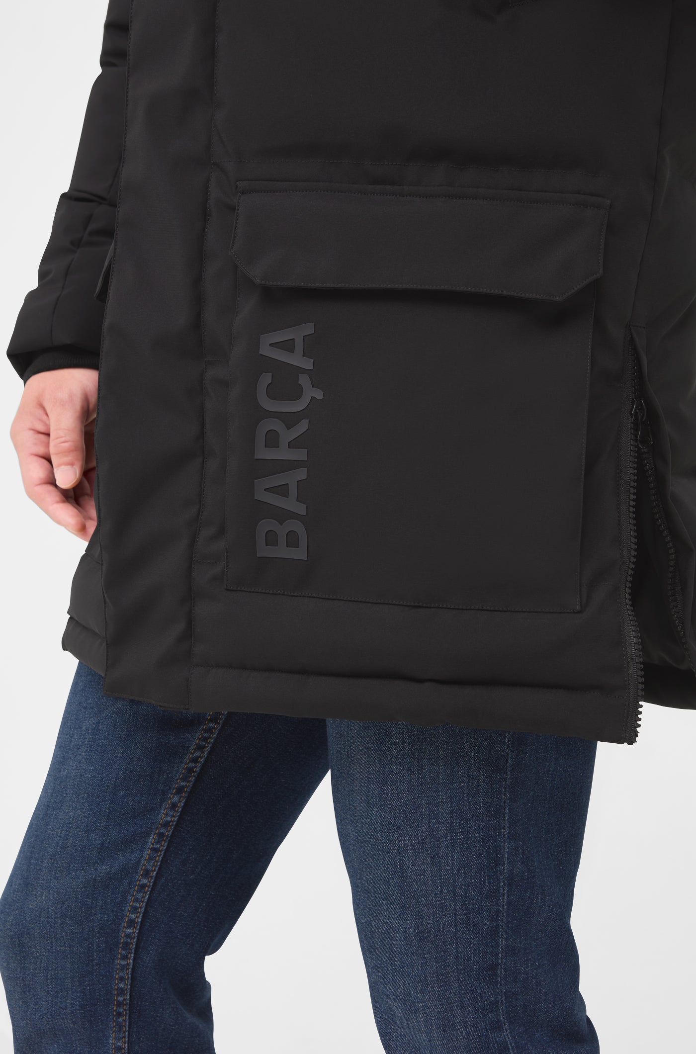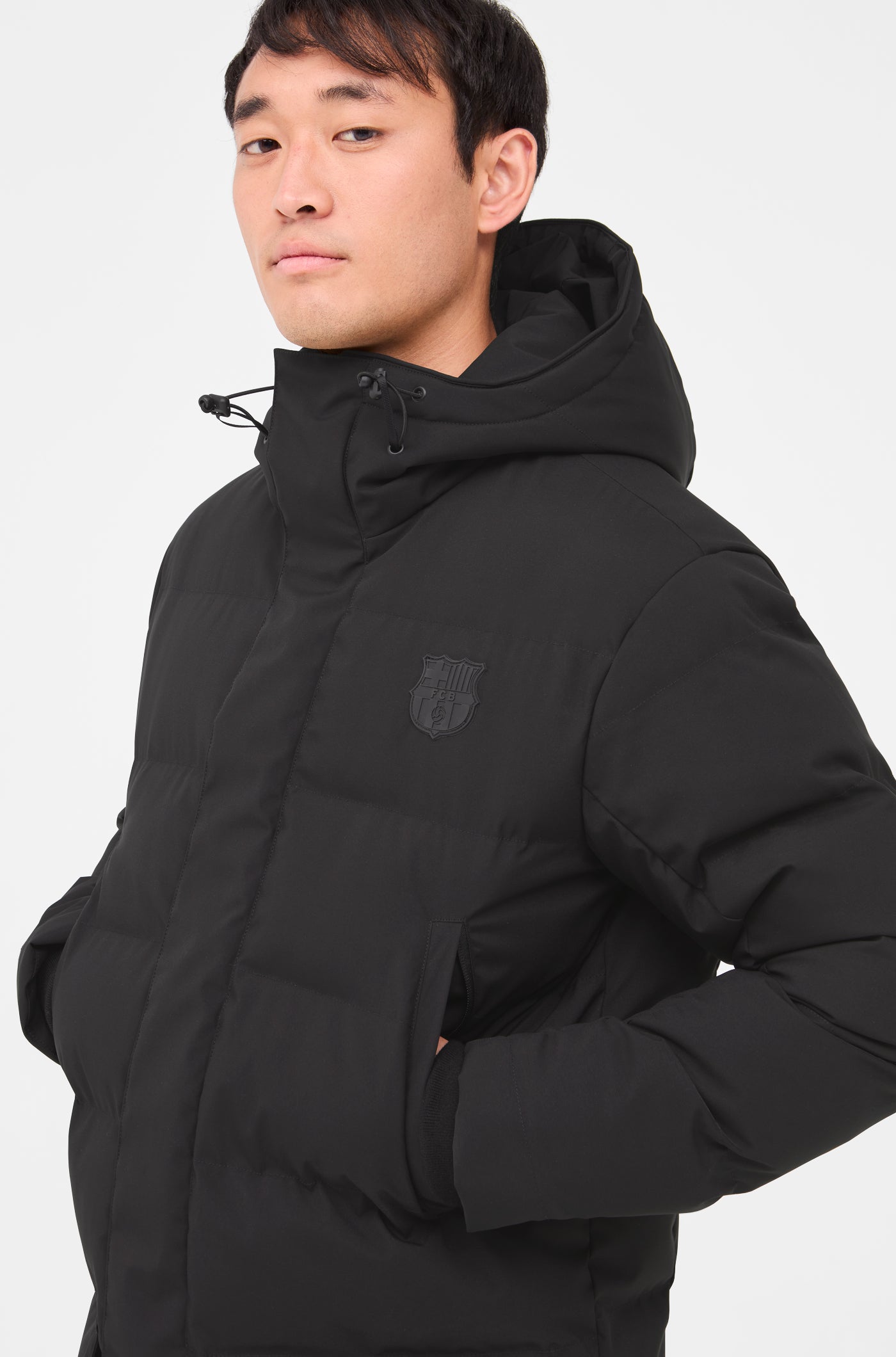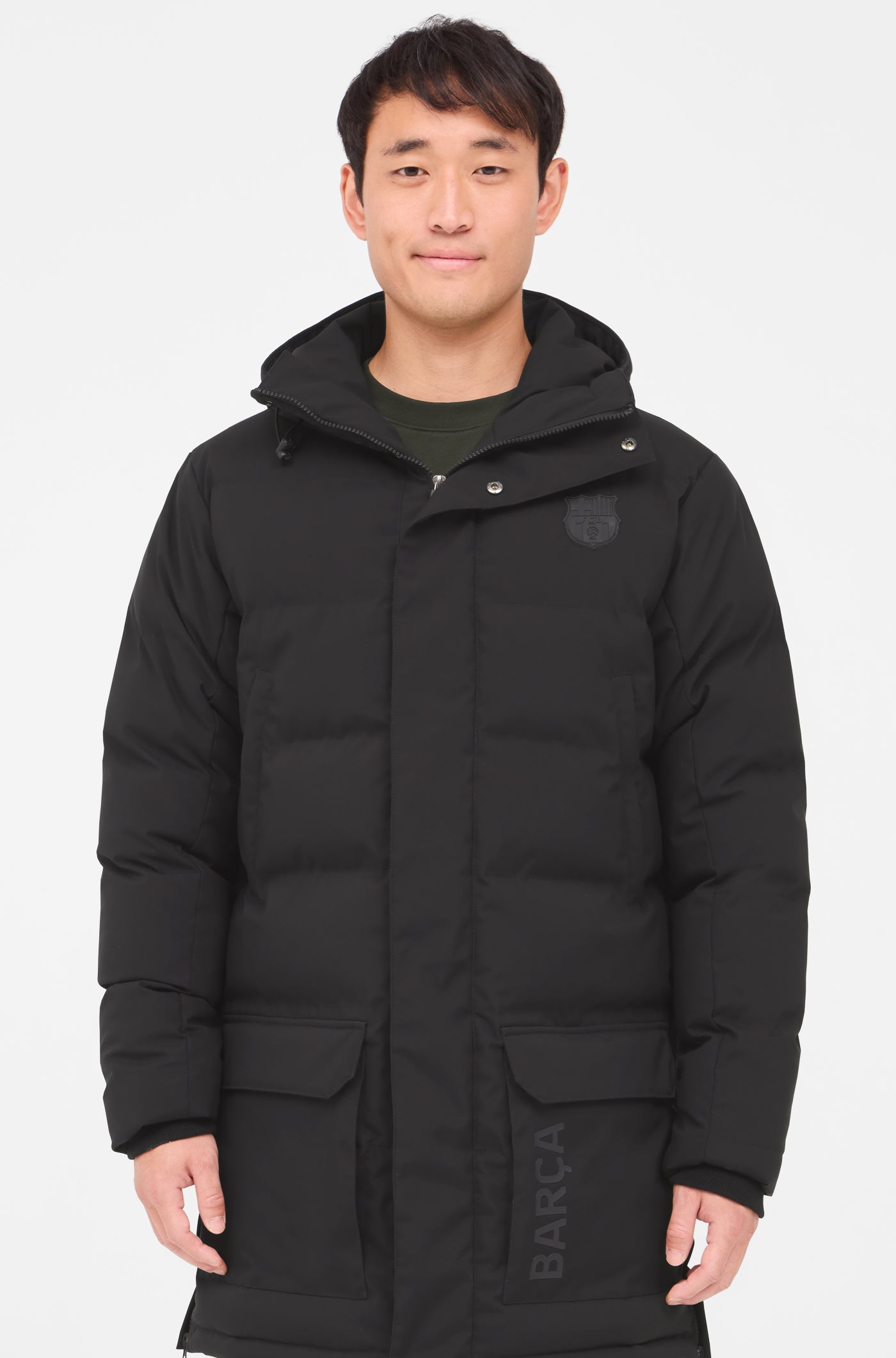 FC Barcelona parka. It has synthetic filling. Hooded collar. Long sleeve. Zip closure. Front pockets: 2 with zipper. Color: black