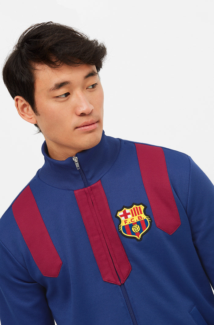 FC Barcelona vintage zip sweatshirt featuring the team’s crest. High neckline. Long sleeves. Elastic cuffs and waist. Front pockets: 2. Colour: Blue-and-scarlet.