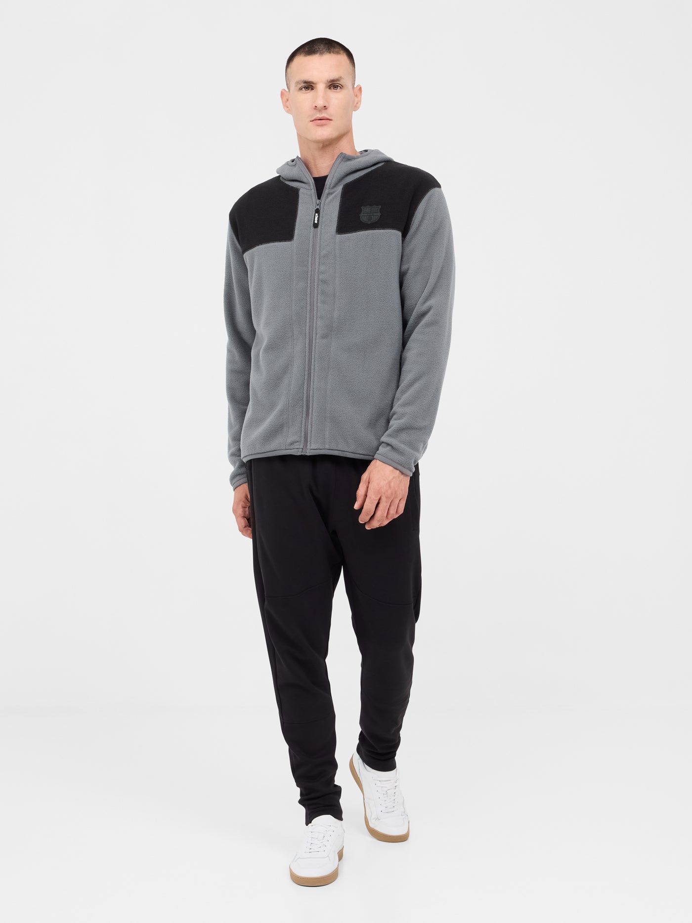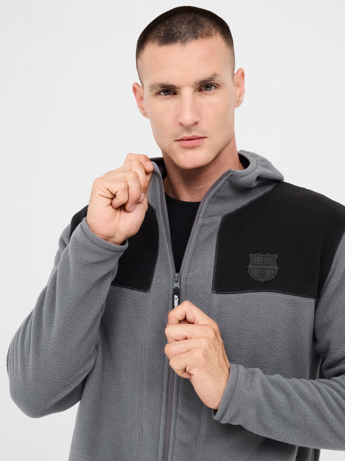 Gray fleece jacket with the embroidered shield on the chest, ""BARÇA"" text and small blaugrana detail on the back.