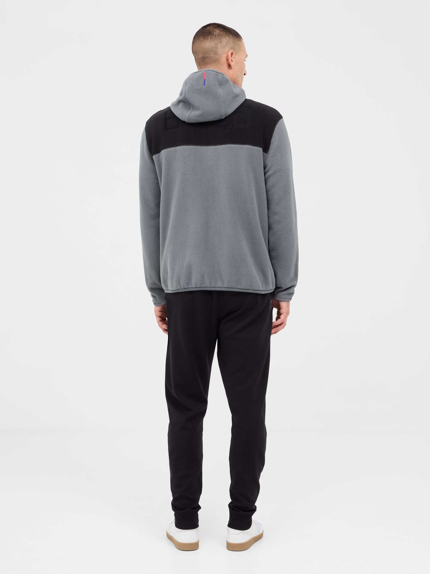 High collar with hood. Long sleeve. Zipper closure. Elastic waist and cuffs. Front pockets: 2 with zipper. Color: black and gray