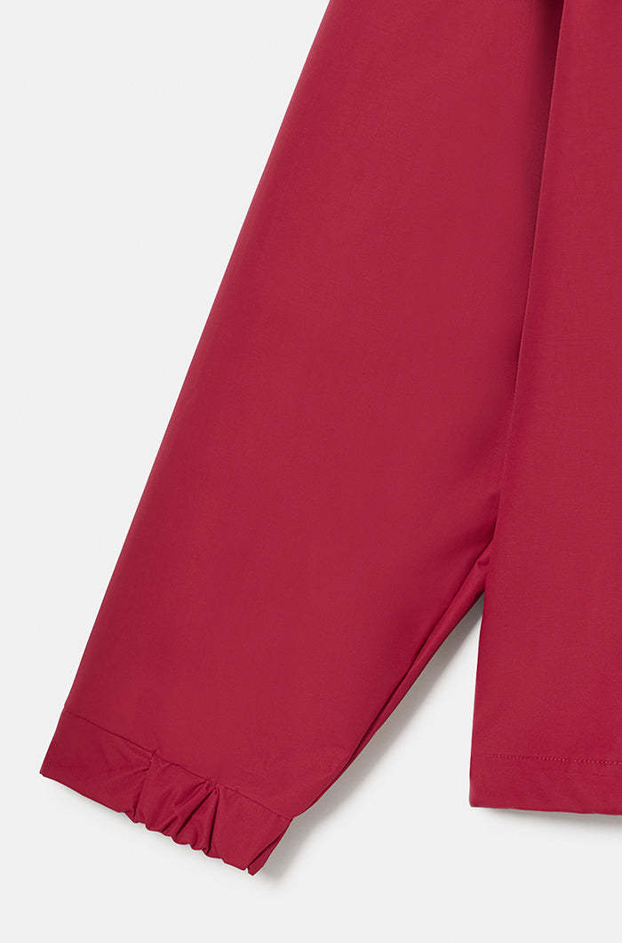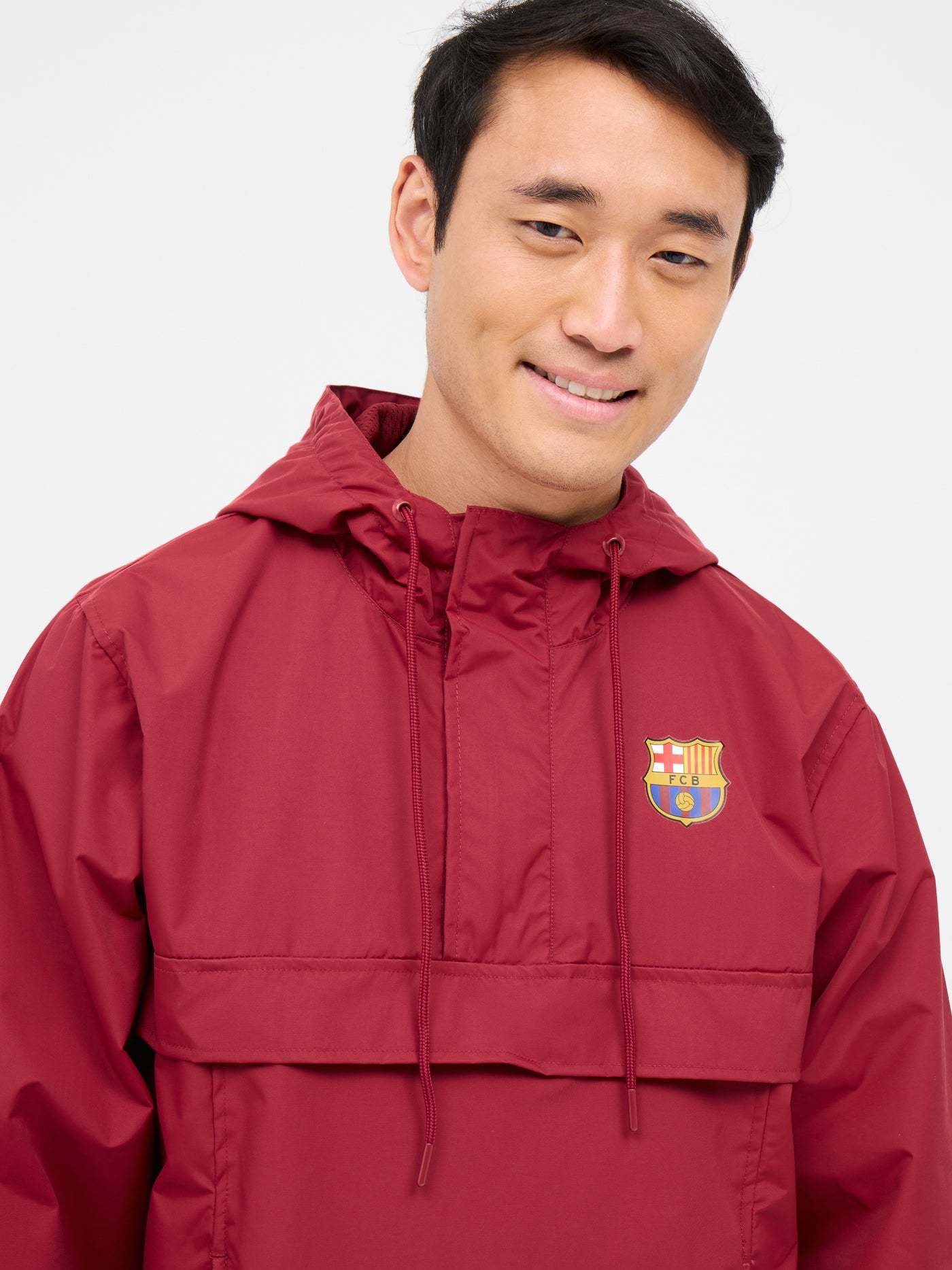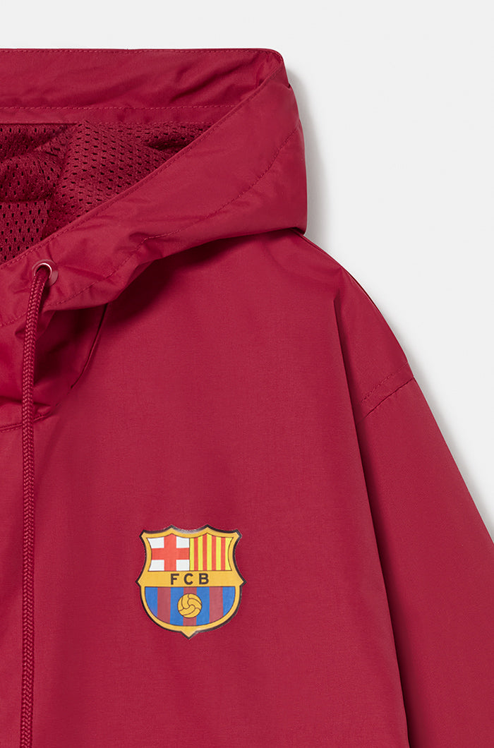Waterproof jacket with the FC Barcelona shield on the chest and contrasting "BARÇA" lettering on the back. High neck with hood. Long sleeves with elastic cuffs. Half-chest zipper closure. Side zipper closure for greater comfort. Front pockets: 2 with zipper. Colour: maroon.